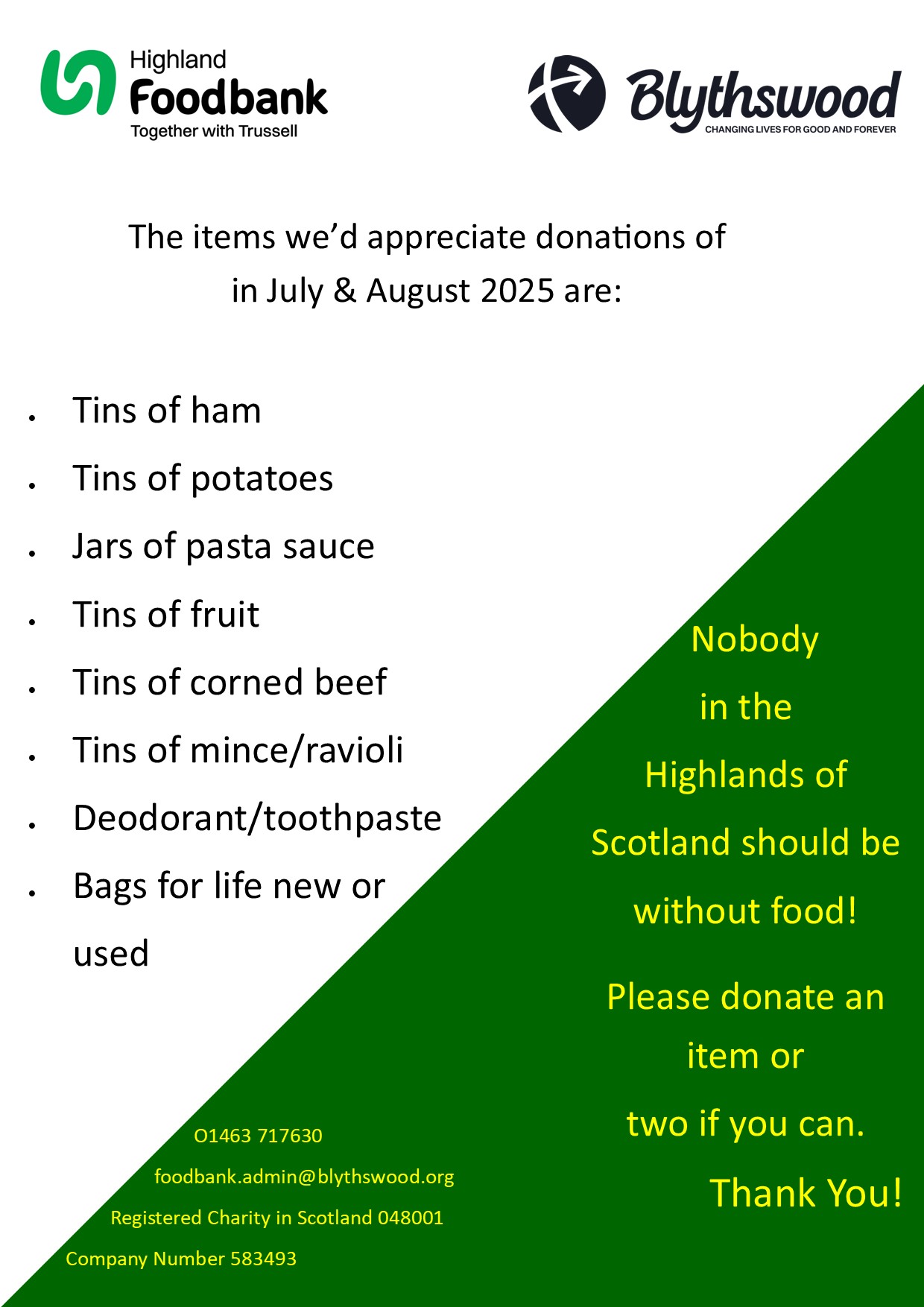 If bringing food to Church is difficult for anyone, they have permanent collection points in Tesco Inshes, Tesco Tain, Asda Inverness and Asda Tain, which are emptied on a weekly basis. Some Co-ops across Highland also have a food donation box for them.