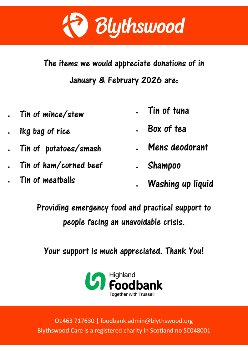 The Highland Foodbank would like to thank everyone who kindly donated last year, they appreciate your ongoing support.