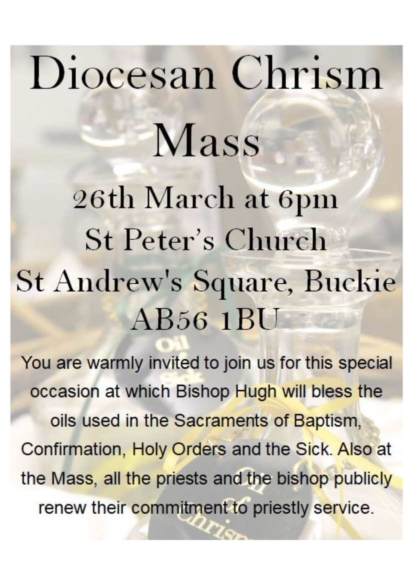 Diocesan Chrism Mass – 6pm 26th March, St. Peter’s Church, Buckie
